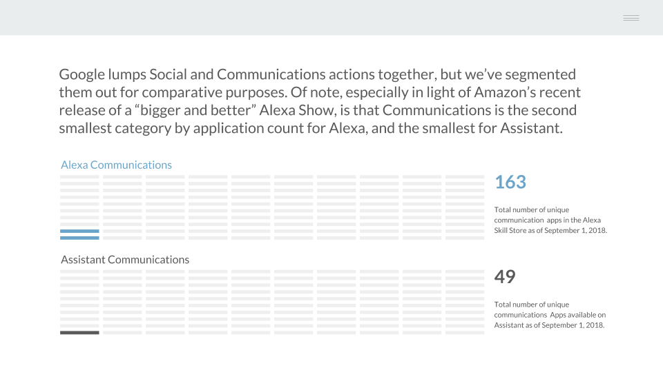 To start we looked at the total number of communication apps on each platform. While Google lumps Social and Communications actions together, we’ve segmented them out for comparative purposes. Of note, especially in light of Amazon’s release of a “bigger and better” Echo Show, is that Communications is the second smallest category by application count on Alexa, and the smallest on Assistant.