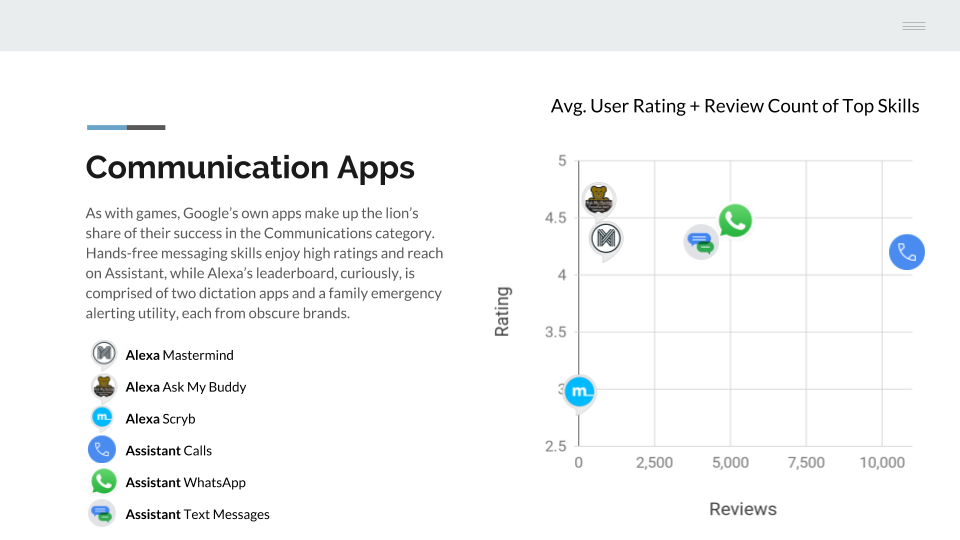 To do this, we analyzed ratings and reviews data on all communication-related apps in the Alexa Skill and Google Actions marketplaces. We found that while voice apps for calls, email and messaging were thriving on the Assistant platform, they were curiously absent or performing poorly on the Alexa platform. These findings and more after the jump.