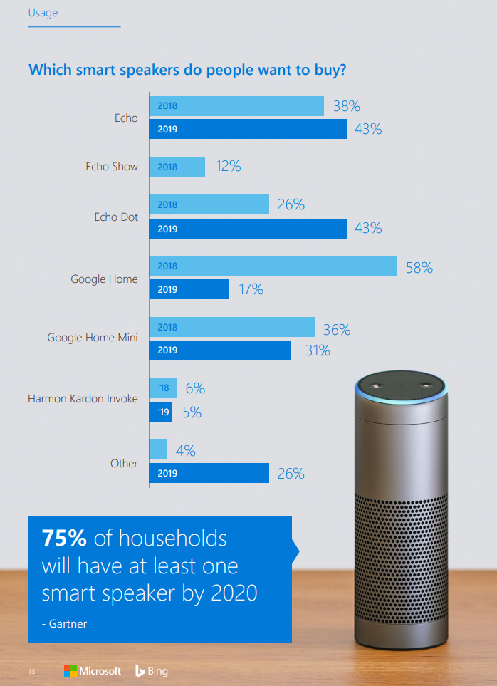 Microsoft’s 2019 Voice Report analyzes the adoption and usage of voice-first technology offering insights into consumer adoption smart speakers and digital assistants. The study shows that most people are using voice search. It also projects that 75% of household will have at least one smart speaker by 2020.