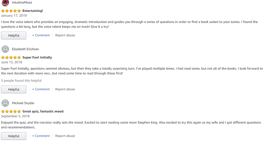 Reviews on the Alexa Skills webpage describe the skill as “entertaining,” “great quiz, fantastic mood,” and “great list!