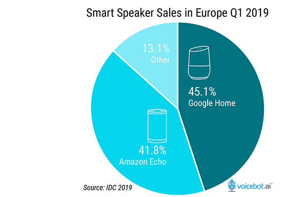 International Data Corporation (IDC) reports that European smart speaker sales will exceed 23 million devices in 2019. Western Europe is responsible for 88.3% of the region share, but Central and Eastern Europe had the biggest increase (31.2% year over year).They also note that Google Home outsold Amazon Echo in Q1 of the year. For more analysis on the report see Voicebot.ai.