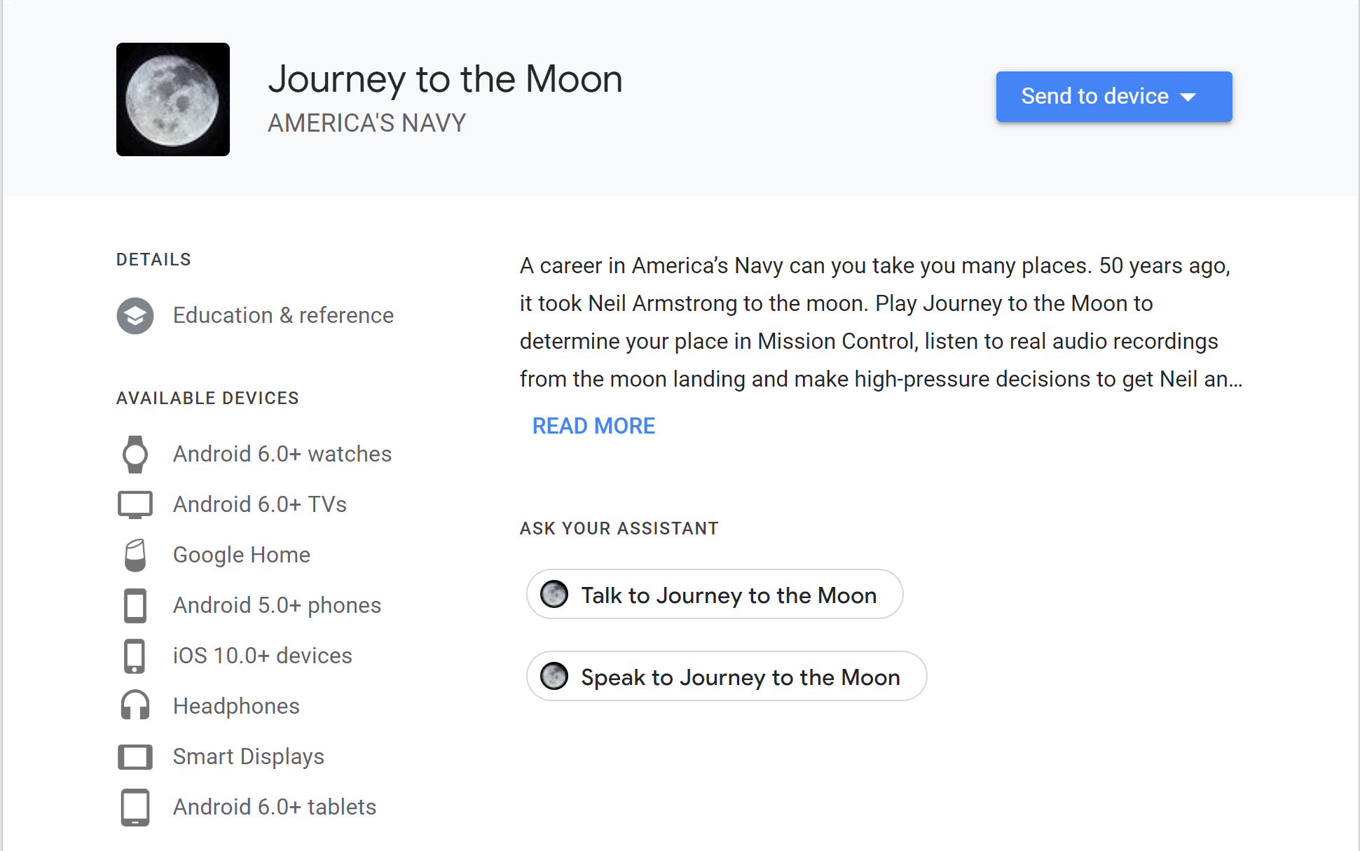 Since we're writing about games... Navy Recruiting Command has launched Journey to the Moon, a game that commemorates the 50th anniversary of the Apollo 11 moon landing. Available on Google Assistant, Google Home or Android, it incorporates audio from the actual mission into the game. The goal of the game is to answer the multiple-choice questions correctly to take the craft safely to the moon and back. Those who win the game are given information on career fields within the Navy. The use of voice-first technology is quite a creative form of recruiting. For more, see MediaPost.