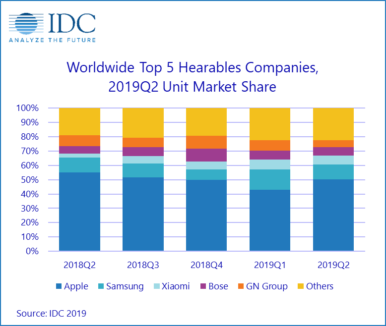 International Data Corporation (IDC) announced this week that global wearable unit shipments for Q2 2019 grew 85% from the previous year’s quarter as shipments reached 67.7 million devices. Hearables, ear worn devices, were among the fastest growing categories capturing 46.9% of the overall wearables market during the quarter, up from 24.8% a year ago. The ICD notes that this growth has stemmed from a "slew of new products and consumers who purchased their second wearable, a hearable, to use in parallel with existing watches or wrist bands." The report reveals that Apple currently leads the hearables market with a 50.2% share in Q2 2019. It was new products such as the revamped AirPods and the latest from the Beats lineup that helped the company grow 218.2% compared to last year. For more, see IDC.