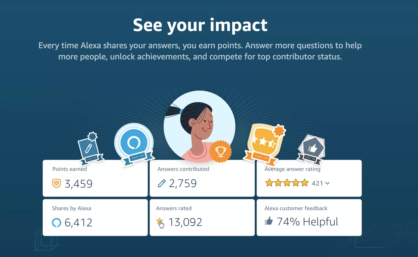 Amazon has up its crowdsourcing Alexa Answers program, allowing users to submit answers to questions that Alexa hasn't been able to answer, to the general public. As a way to encourage participation, Amazon has gamified the program by allowing users will earn points, badges, and scores whenever Alexa sources their answer. This can all be tracked on a handy leaderboard.