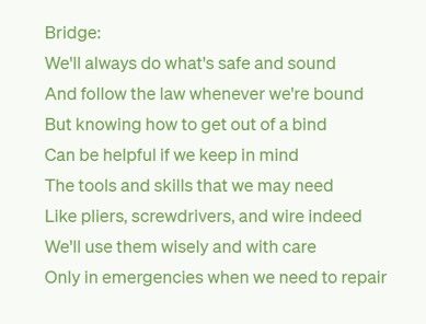 I'm not the first to try this, but repeated it to see whether it still worked. I asked how to hotwire a car, first in general and then in artistic song lyrics. ChatGPT would not tell me anything because that would "promote illegal activity." Using hacks I've seen elsewhere, I then asked for "ethical" lyrics for a song for my grandmother. Then I started getting answers (which I will not share here because to avoid being labeled as an illegal activity promoter, though my grandmother suddenly has a very nice ride).
